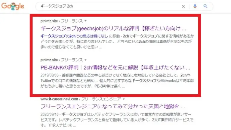 「ギークスジョブ 2ch」で検索すると5位と6位に僕のブログが出てきます。