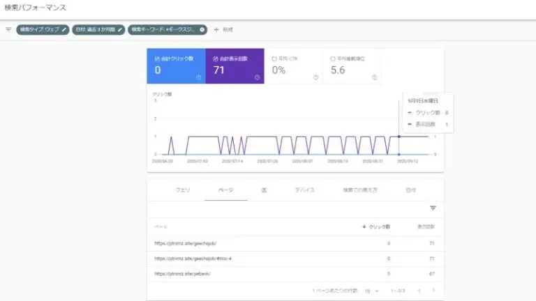 「検索パフォーマンス」から「検索キーワード」で検索、ページタブをクリックすると複数のページがランクインしていることがわかります。