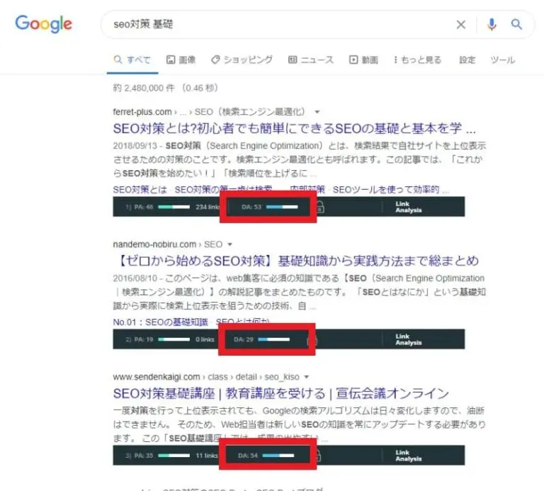 なので、ドメインパワーの確認もあわせて行う方が良いですが、僕は無料で使えるMozBarを使っています。